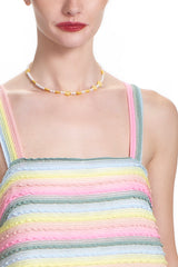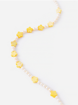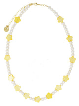 This adorable Cloverpost necklace features yellow flowers with mother of pearl, freshwater pearl and a heavy 14K yellow gold over brass clasp.