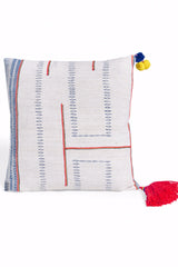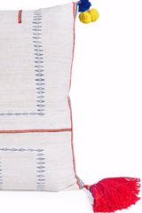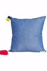 Rectangular vintage textile pillows. Each one is unique and hand made with fantastic color pop tassels on one side and small ball trim around the edges. Soft denim fabric on back and invisible zipper. Filler NOT included.