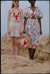 This tote bag is perfect summer accessories! The FESTIVE FEAST TOTE showcases a lobster motif with beaded crochet, collage, and gingham lining. Crafted from raffia, it's perfect for carrying a lobster roll or other outdoor feast!
