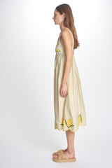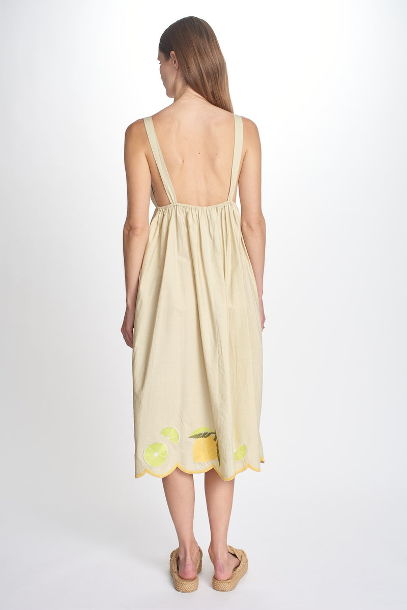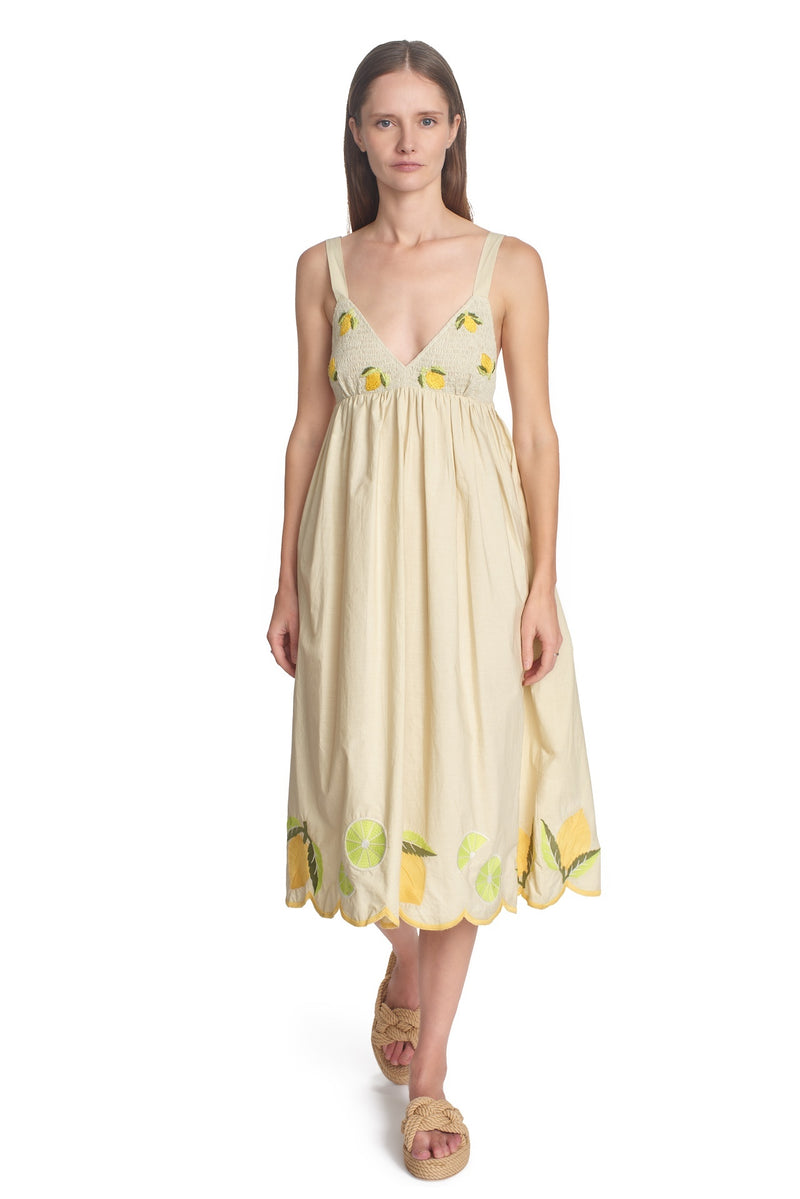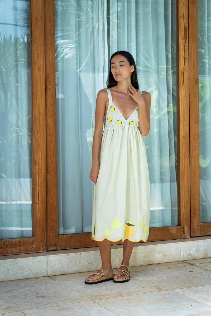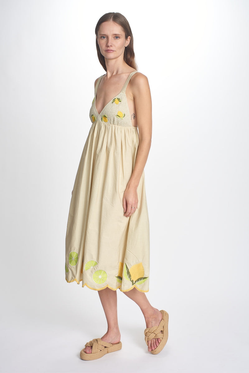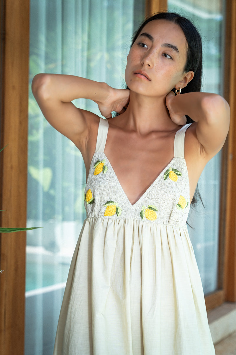 The Frankie Dress, v neck, hand smocking on bust with lemons, embroidered lemons on the hem, elastic in back.