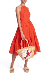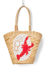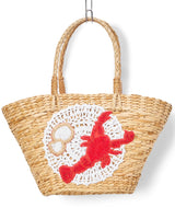 This tote bag is perfect summer accessories! The FESTIVE FEAST TOTE showcases a lobster motif with beaded crochet, collage, and gingham lining. Crafted from raffia, it's perfect for carrying a lobster roll or other outdoor feast!