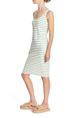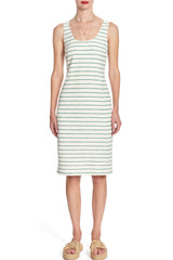Stay comfortable and stylish in the THE KATIE DRESS. This knit pull on tank dress is crafted from a terry stripe fabric in green and ivory for a classic look.