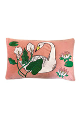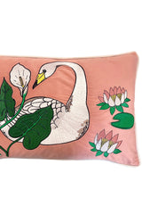 Embroidered bolster cushion cover with AN embroidered swan and lotus flowers. Original hand-drawn illustration of by Karen Mabon.