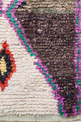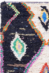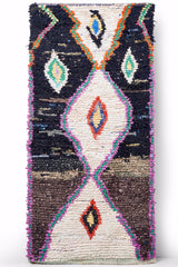 Fantastic accent dark ground Moroccan Boucherouette Rug. These look great layered or alone. This one features a dark background with a multi colored diamond motif made up of intersecting lines This Rug pattern created by layering various scraps of materials mostly cotton. And signature fringe on one side.