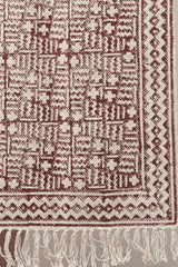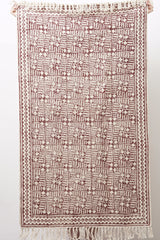 Cotton hand block printed rug available in 2 sizes. This Maroon printed Rug has a intricate detailed print and fringe on the ends of the rug. New condition; patterns may vary as they are hand made and there maybe some irregularity on the fringes just adds to their charm