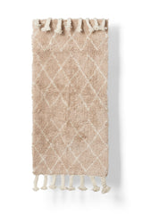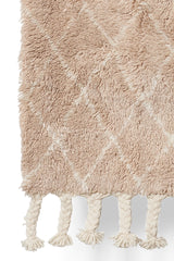 Hand Made in India. Wool shag rug featuring a diamond pattern and braided fringe. Each item is unique due to its handmade nature.