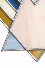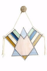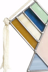 Meet in the middle color blocked stained glass. Includes signature rope tassels by Corey Lynn Calter. Made of sky blue, mustard yellow and soft pink colored glass and is set in lead. The stripe intersects the triangle. Hangs with cotton rope cord and tassels.