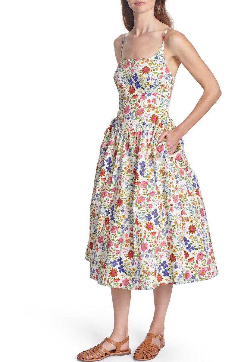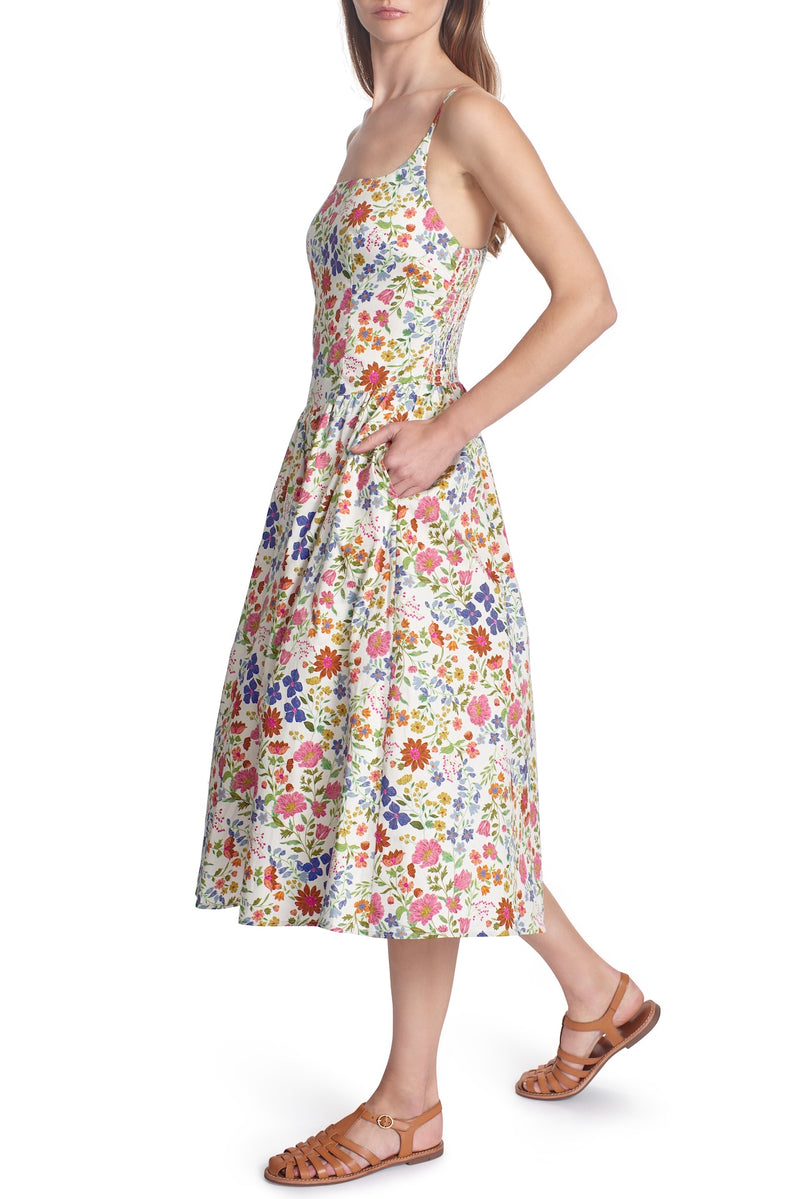 The Valentina fit and flare dress, elastic smocking in the back, midi length, lined with a tulle petticoat. Has pockets