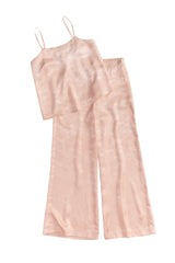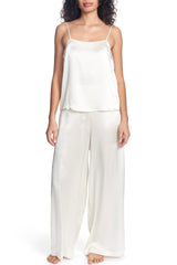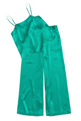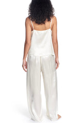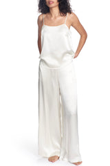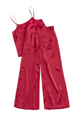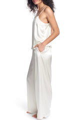 Introducing the silk BLAIRE LOUNGE SET - the perfect combination. With a slip top and adjustable straps. The full sweep pant features an elastic back and pockets with a side button.