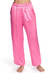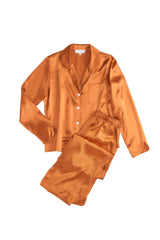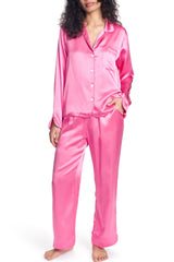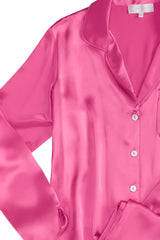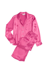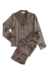 Upgrade your lounge game with our Opal Silk Pajama set! Made with silk charmuse, our set features a button front, pant and breast pockets, and elastic waist for a comfortable fit. Classically updated with curved piped cuffs and leg openings.