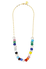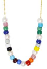 This adorable Cloverpost necklace features colored glass beads mixed with freshwater pearls strung on a gold chain, 14K yellow gold over brass.