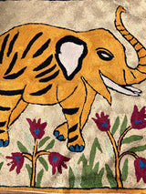 Hand Made in Varanasi, India and purchased while traveling in India. Embroidered by hand using a chain stitch to form an elephant. Each item is unique due to its handmade nature.