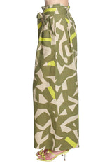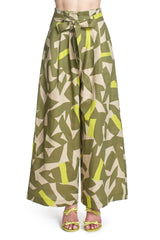 The Tony pant, it a wide leg dramatic pleated trouser. It has a self tie and pockets. Great for layering. Shown here in our Geo print.