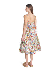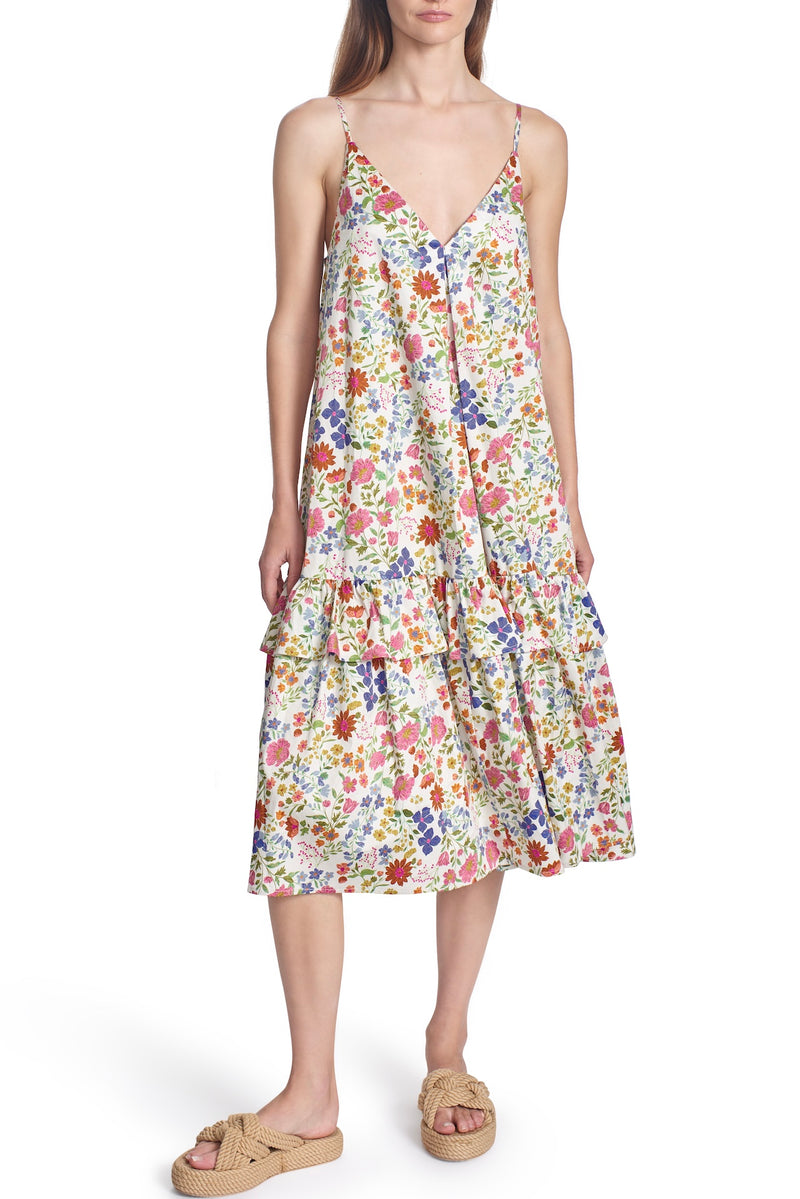 The Macie dress. Floral with ruffles. Pull on style, V-neck with adjustable spaghetti straps.