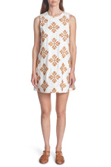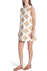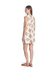 The Veruca mini dress, embroidered, curved side pockets, back buttons, lined.