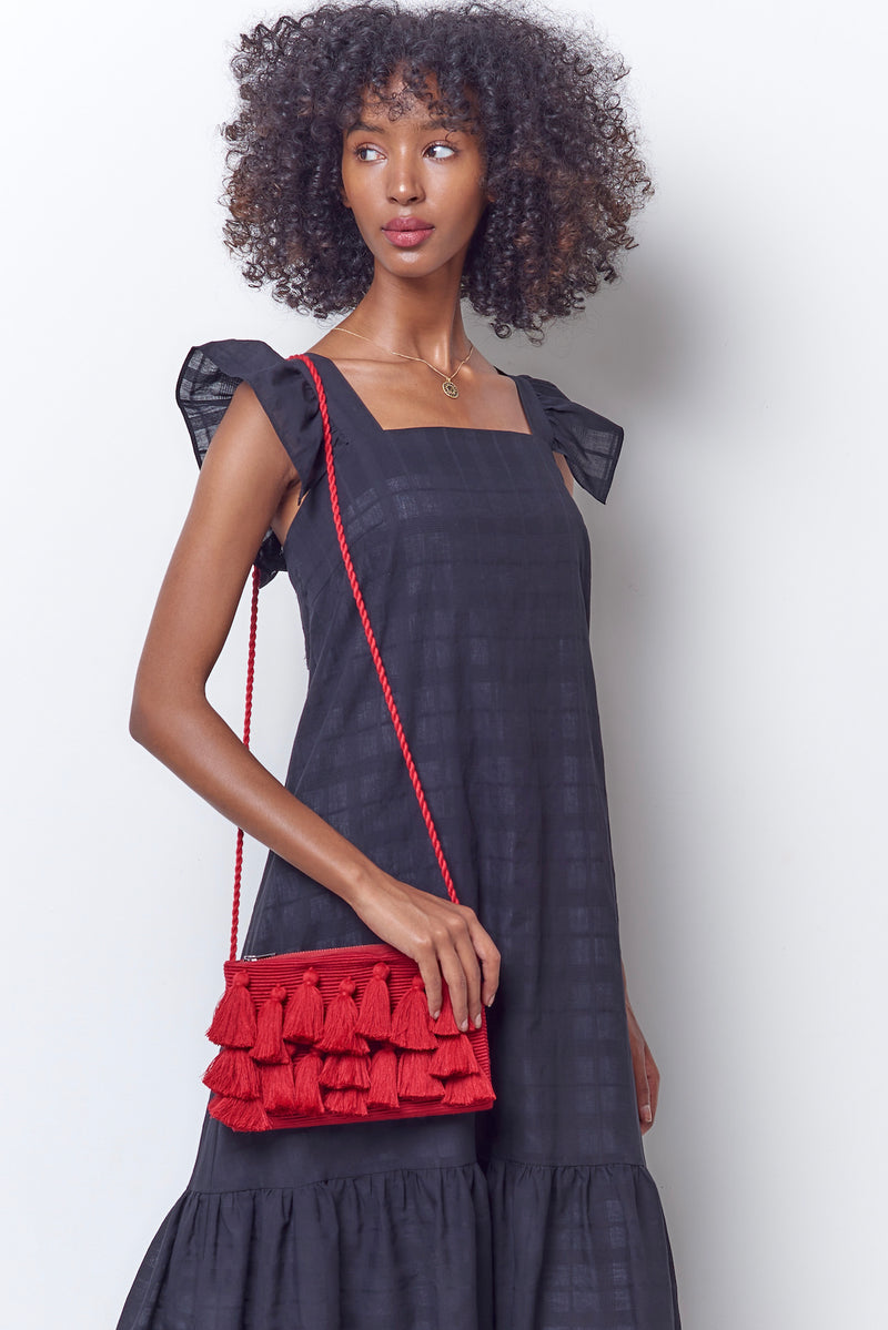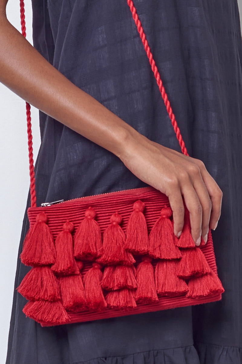 100% Pima mercerized cotton. Tassels and handle: 100% polyester. Lining; sheep leather. Closure with internal magnets. Dry clean.