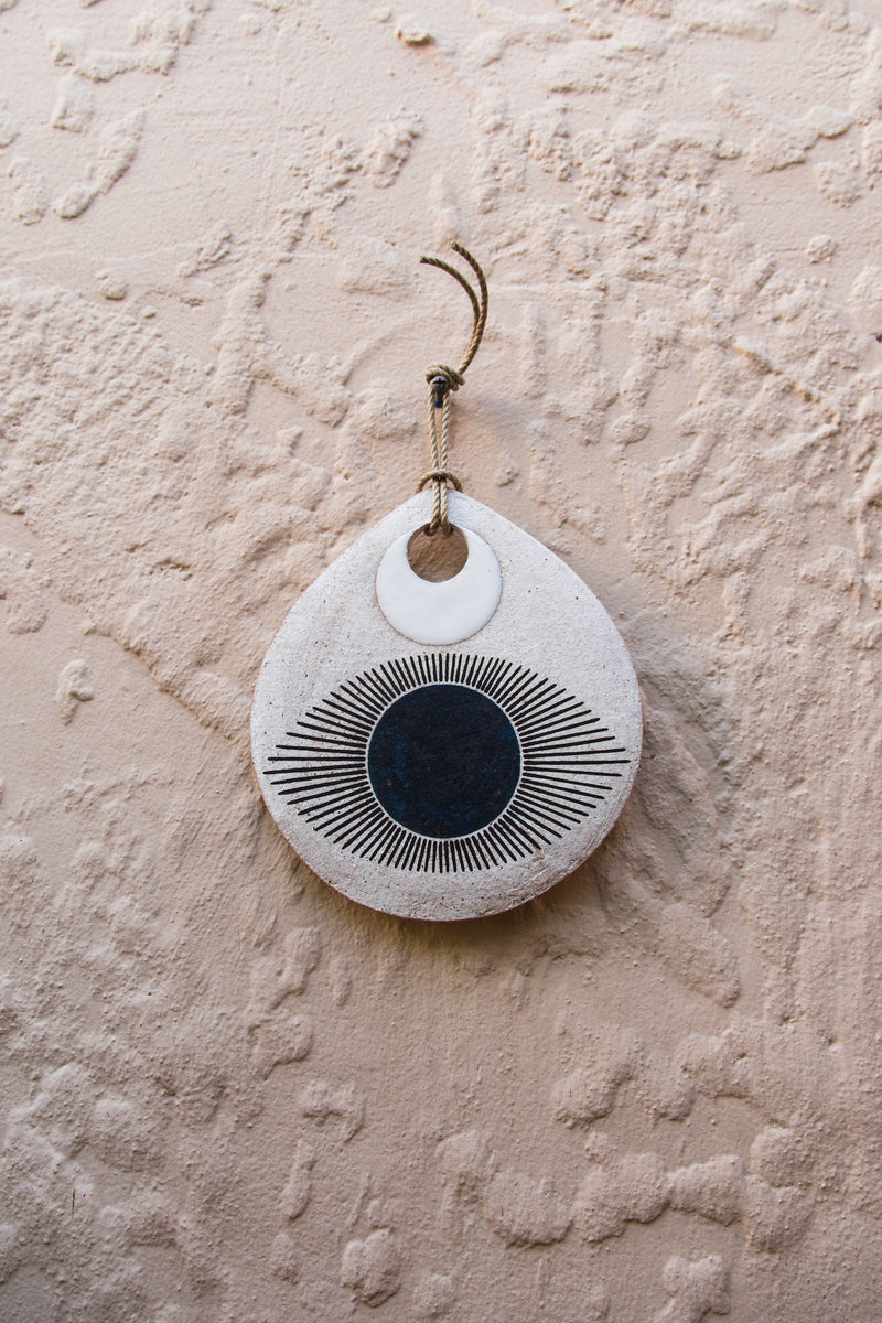 MQuan Hand built in NYC. Hand built teardrop shaped wall hanging depicting an indigo eye and sphere design. Hand painted painted. Each item is unique due to its handmade nature.