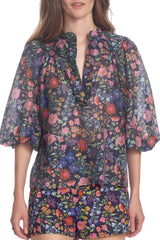 The Corinne top has a deep V neck with placket, a yoked shoulder and blouson 3/4 sleeve. Shown here in our floral print on sheer fabric.