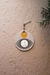 MQuan Hand built in NYC. Hand built teardrop shaped wall hanging depicting a black eye and sphere design. Hand painted painted. Each item is unique due to its handmade nature.